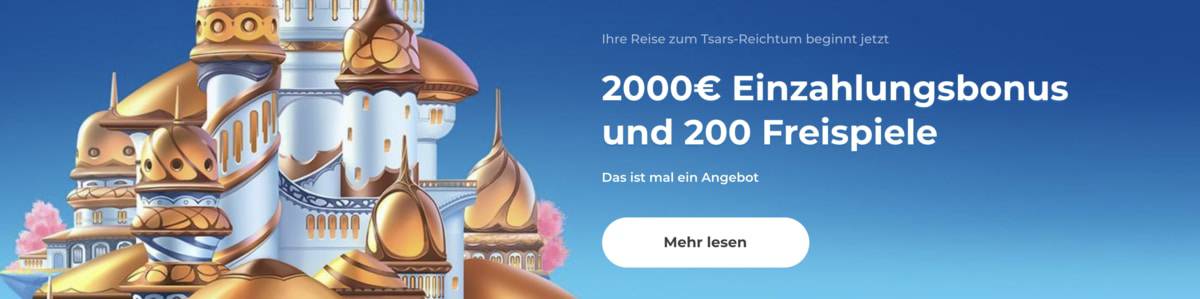 Das Tsars Online Casino ist ein echtes Juwel unter den Glücksspiel Seiten. Diverse Zahlungsmethoden, gute Gewinnchancen, sehr große Spielauswahl sowie Auszeichnungen mit dem “Best New Casino 2020” Award. Zudem ein Willkommensbonus in Höhe von bis zu 2.000€ und 200 Freispiele.